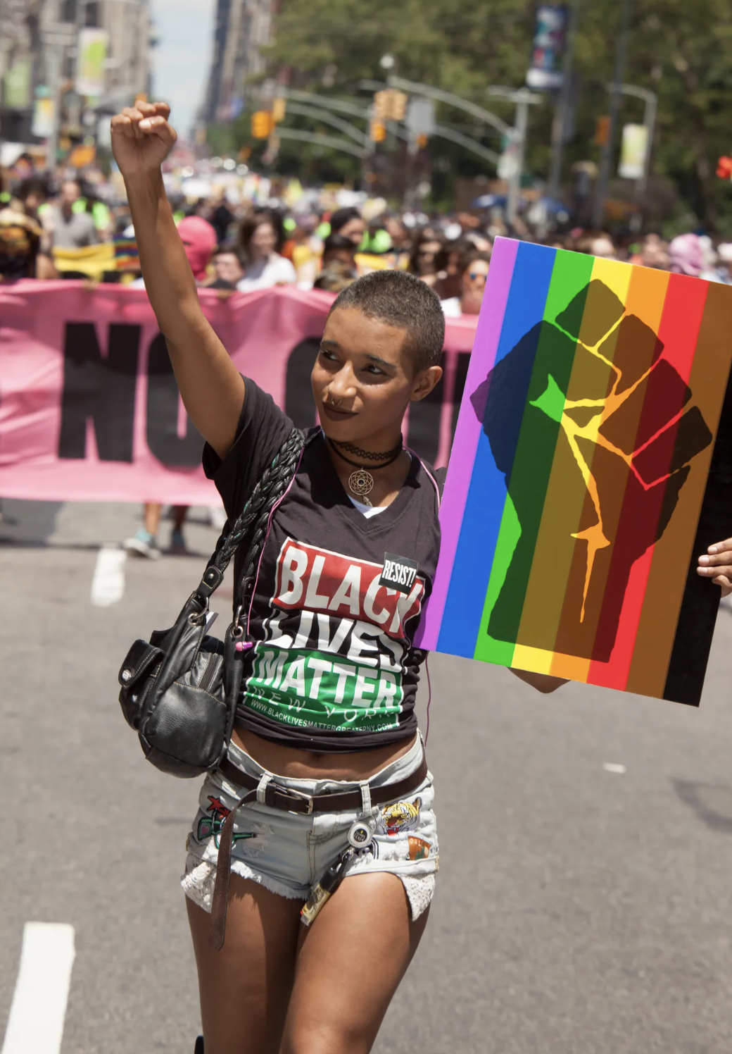 Erika L. Ewing artivist and graphic designer carries the BLMNY Liberation Poster at the NYC Pride Parade. Photo Credit: Zilna Renfro